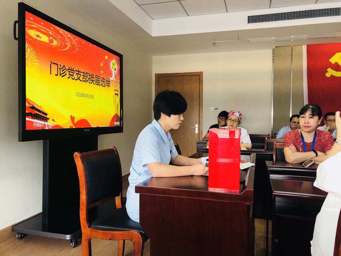 我院门诊党支部顺利完成换届选举工作为加强医院基层党组织建设,我院门诊党支部按照医院党委统一部署于5月29日中午召开全体党员会议,在党委副书记黄爱林和党办主任严沁的带领和指导下,顺利完成了支部换届选举工作。 首先,支部书记戴清辉同志代表支…查看详情+