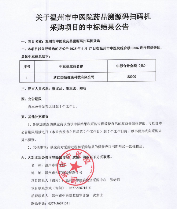 关于香蕉视频 药品溯源码扫码机采购项目的中标(成交)结果公告