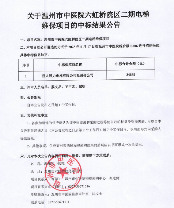 关于香蕉视频 六虹桥院区二期电梯维保项目的中标(成交)结果公告
