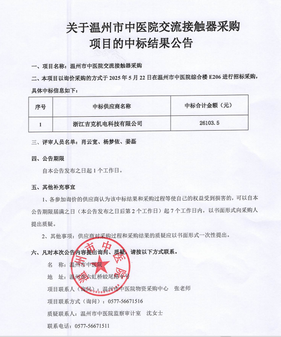 关于香蕉视频 交流接触器采购项目的中标(成交)结果公告