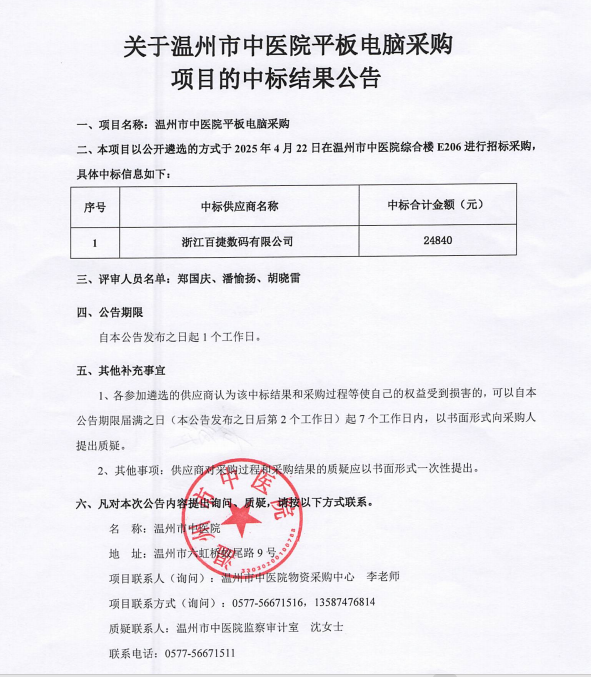 关于香蕉视频 平板电脑采购项目的中标(成交)结果公告