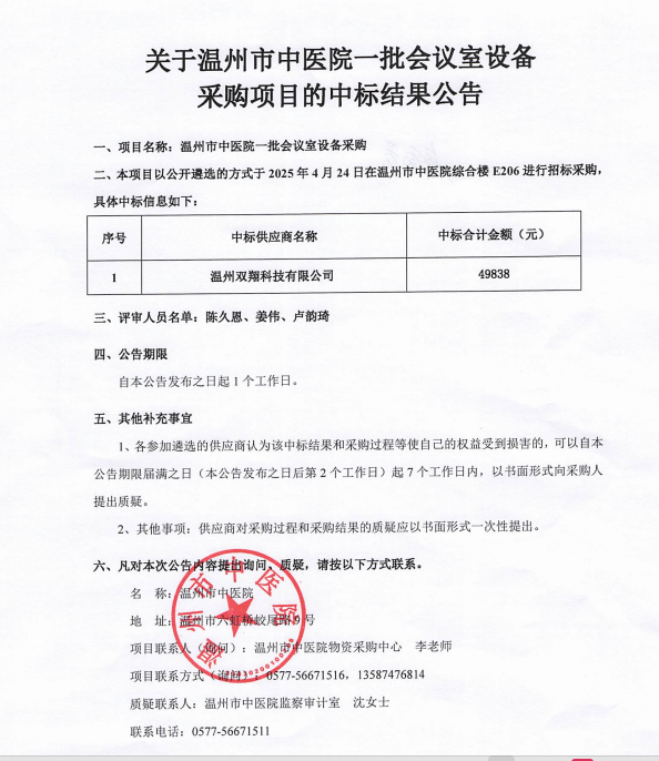 香蕉视频 高压氧舱新建工程竣工检测(重)项目询价成交结果公示香蕉视频 高压氧舱新建工程竣工检测(重)项目于2025年4月25日下午14点30分在六虹桥院区综合楼E309会议室开标,最终中标结果如下,特此公告。公示期为三天,从公示之日起计算。在公示期限内,投标人和其他利害关系…查看详情+