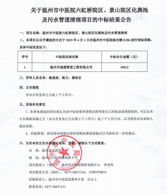 关于香蕉视频 六虹桥院区、景山院区化粪池及污水管道清理项目的中标(成交)结果公告