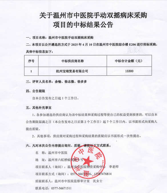 关于香蕉视频 一批高压氧专用产品采购(重)项目的流标公告一.采购人名称:香蕉视频 二.采购项目名称:一批高压氧专用产品采购(重) 三.采购方式:公开遴选(有效投标供应商不少于3家) 四.采购公告发布日期:2025年3月25日 五.定标日期:2025年4月1日 六.中标结果…查看详情+