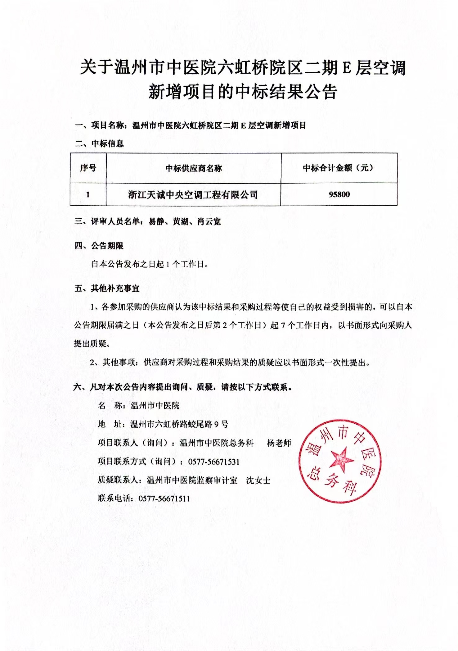 关于香蕉视频 六虹桥院区二期E层空调新增项目的中标结果公告
