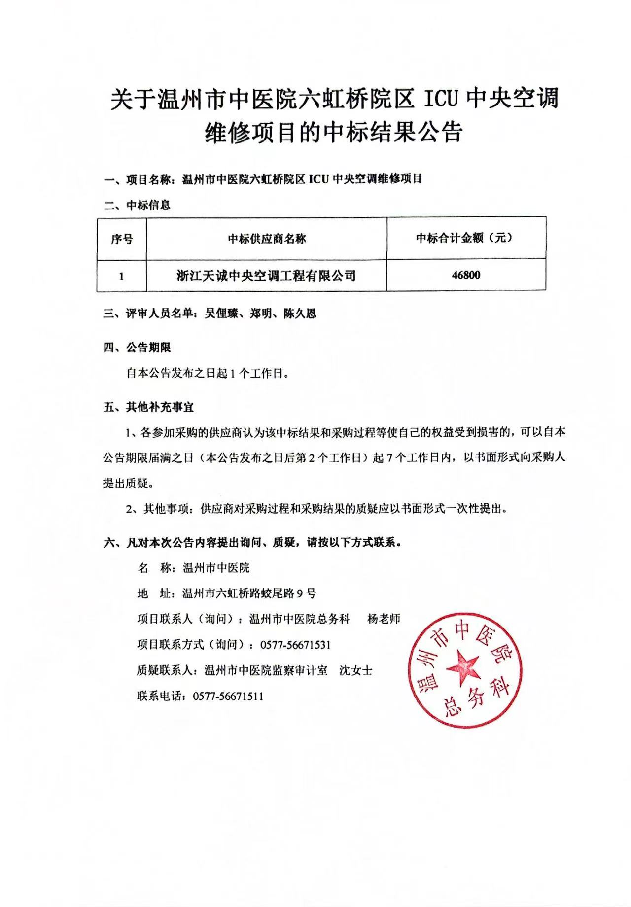 关于香蕉视频 六虹桥院区ICU中央空调维修项目的中标结果公告