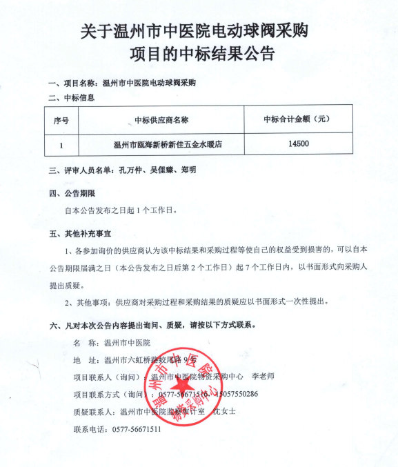 关于香蕉视频 电动球阀采购项目的中标(成交)结果公告