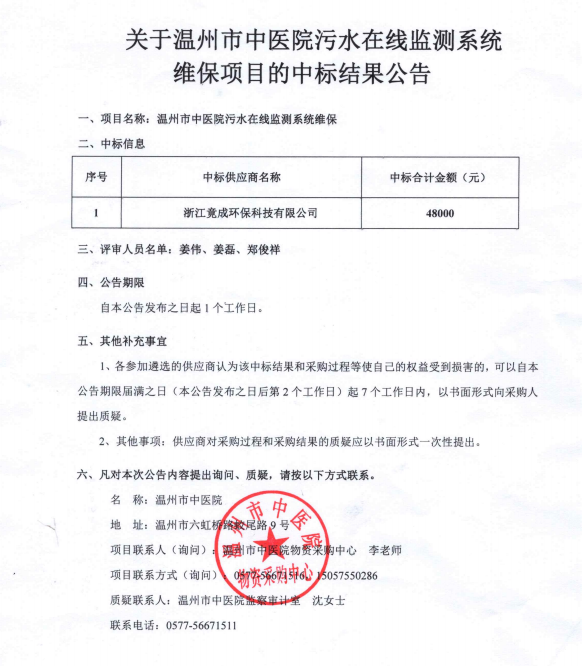 关于香蕉视频 污水在线监测系统维保服务项目的中标(成交)结果公告