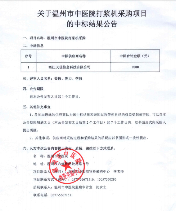 关于香蕉视频 打浆机采购项目的中标(成交)结果公告