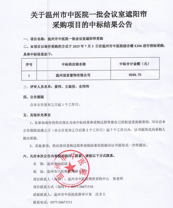 关于香蕉视频 一批会议室遮阳帘采购项目的中标(成交)结果公告查看详情+