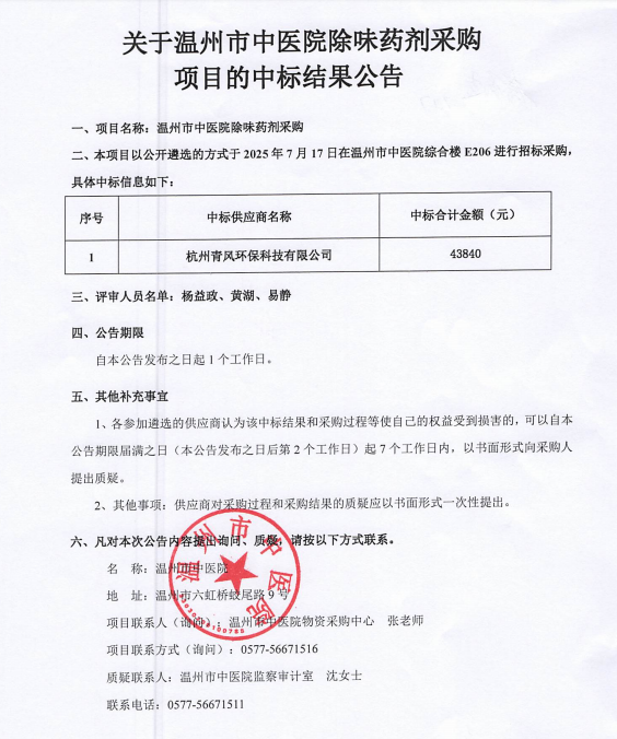 关于香蕉视频 除味药剂采购项目的中标(成交)结果公告