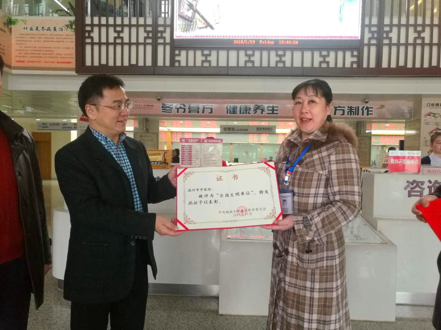 市文明办主任吕朝晖一行来院送荣誉1月19日上午,温州市委宣传部副部长、市文明办主任吕朝晖、副主任丁柏强、处长翁曙明一行专程送“全国文明单位”荣誉牌、证书到香蕉视频 六虹桥院区。党委副书记黄爱林代表医院接过“全…查看详情+