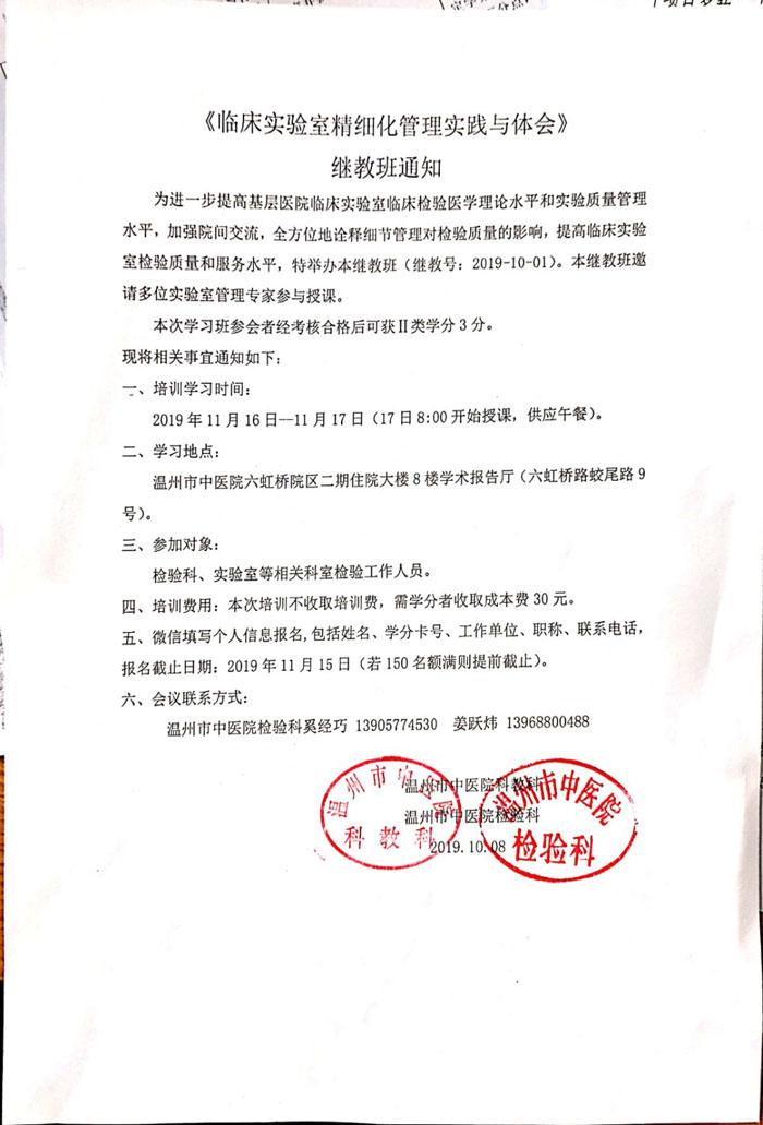 关于举办市级继教班《临床实验室精细化管理实践与体会》的通知