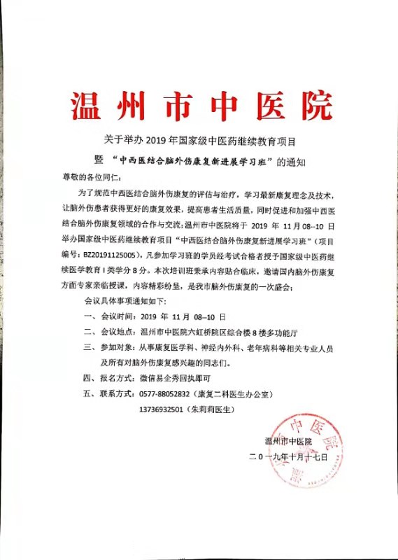 关于举办国家级继教《中西医结合脑外伤康复新进展学习班》的通知