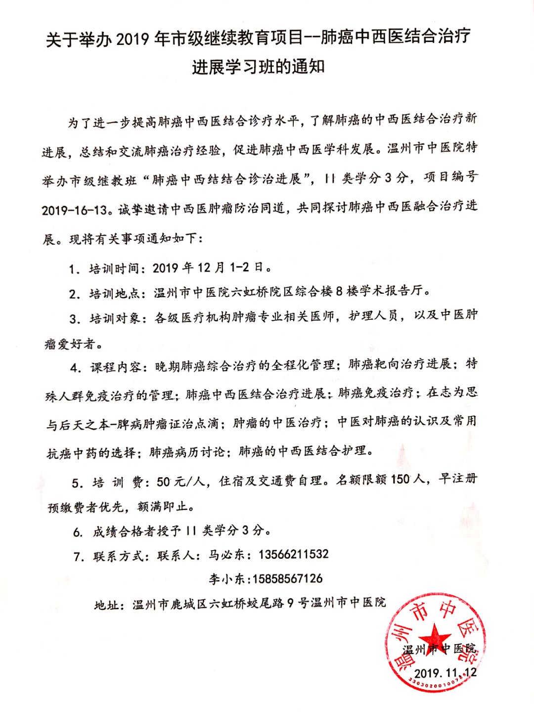 关于举办2019年市级继续教育项目《肺癌中西医结合治疗进展学习班》的通知