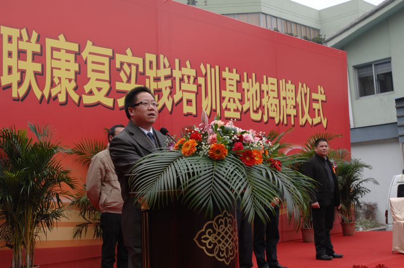 12月29日,市残联、市中医院(温州市康复医疗中心)康复实践训练基地揭牌仪式在我院景山院区隆重举行,任玉明副市长出席仪式并揭牌,王蛟虎副秘书长主持仪式。市残联夏克潘理事长、市卫生局朱锦平局长、我院黄建平院长分别致辞,温州地区各级残联领导及各医院的康复科专家参加了仪式。