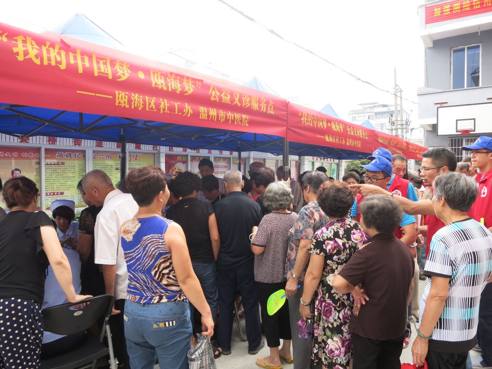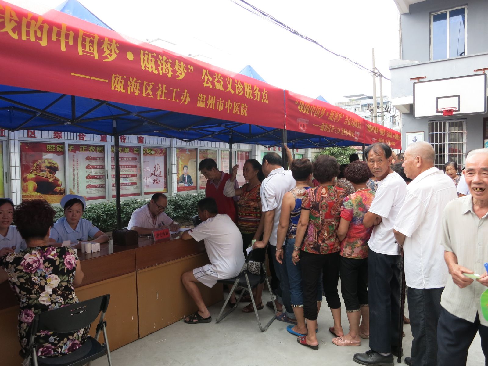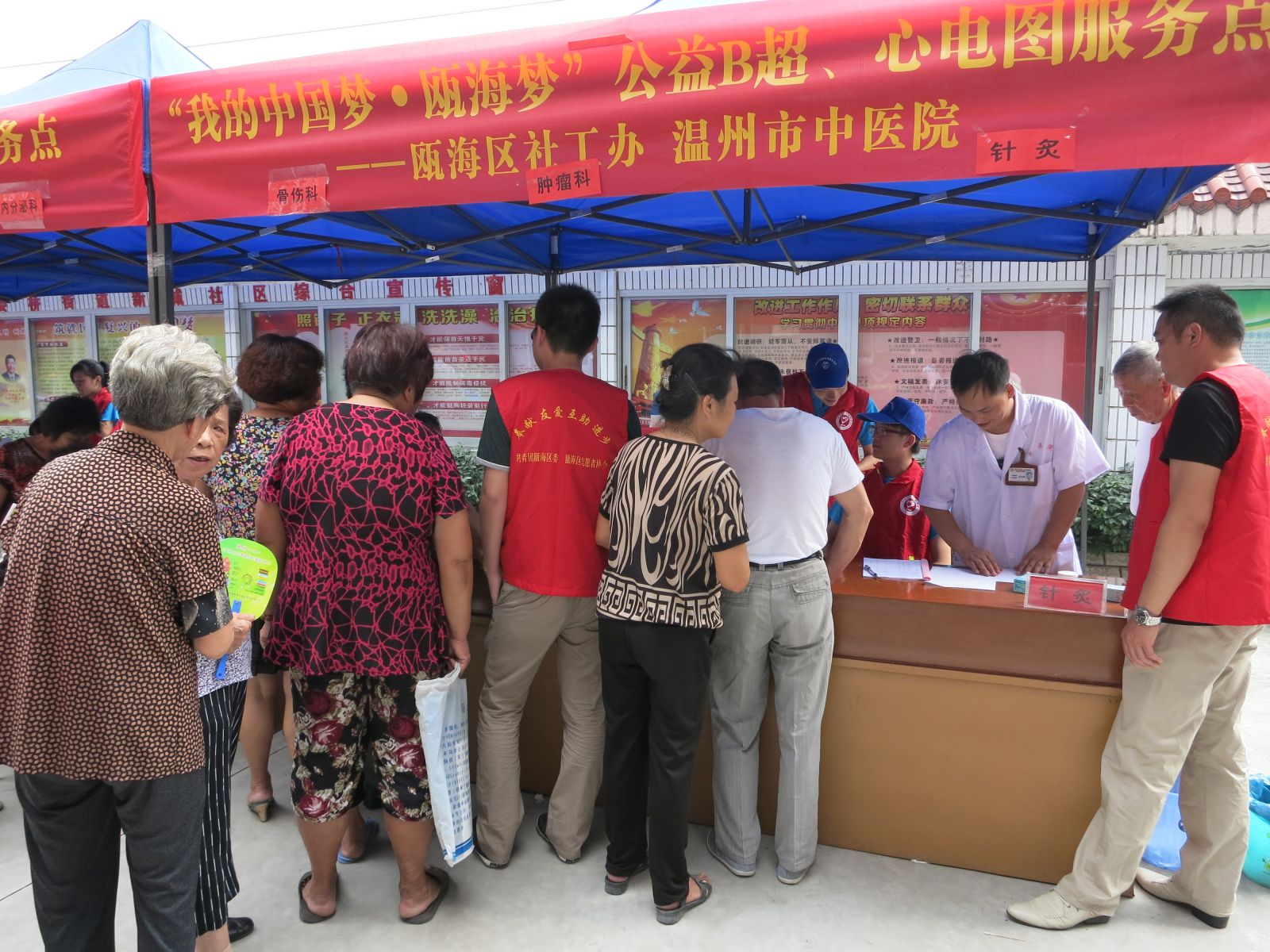 2013年9月18日,为响应市卫生局“三三行动”及“三好一满意”活动的号召,更好地为人民群众服务,结合医院90周年院庆活动。我院党委组织消化科、心内科、骨伤科、肿瘤科、针灸科、妇科等专家医生及医护人员共15人,前往瓯海区娄桥街道新城社区,参加瓯海区民政局组织的“我的中国梦·瓯海梦”进社区服务主题实践公益活动。活动现场为300余名当地居民提供健康咨询以及B超、心电图、测血糖、测血压检查等各项义诊活动,并免费发放价值8000余元的药品及健康宣传资料300余份。活动受到娄桥街道新城社区干部及当地群众的欢迎。温州电视台经济频道及《温州日报》予以报道。