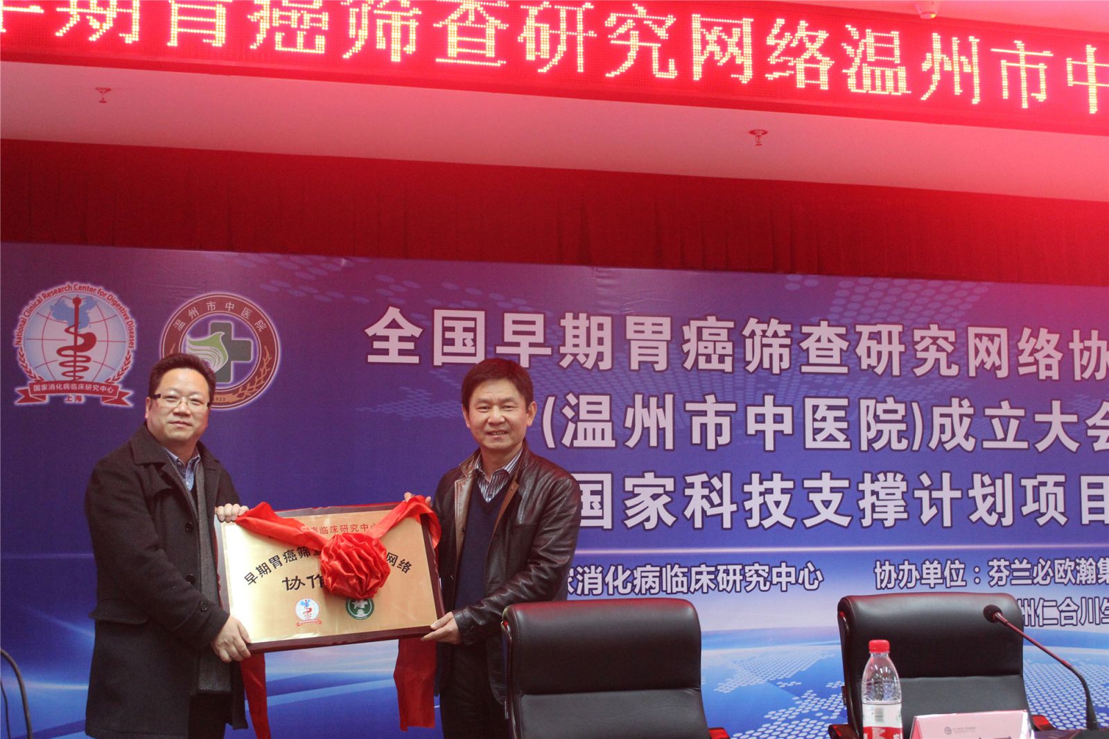 3月13日,温州首家早期胃癌筛查研究协同网络协作中心在我院成立。浙江省医学会消化学分会主任委员吕宾、温州市卫计委主任程锦国、温州医科大学附属第一医院消化内科主任吴建胜、我院院长黄建平、副院长施仲义及温州地区的消化内科专家学者百余人参加了揭牌仪式。