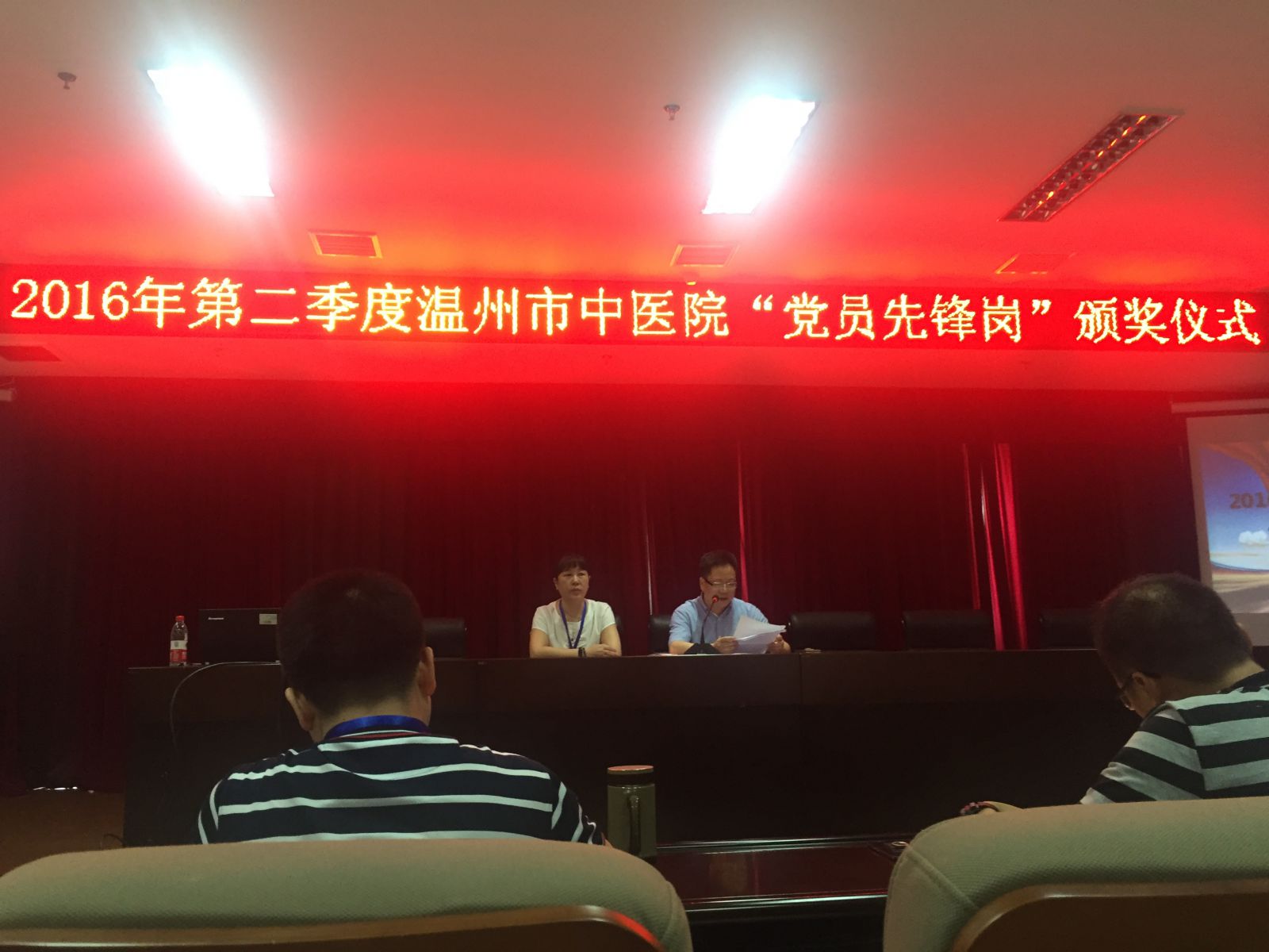 会上,我院黄建平院长还发表了重要讲话,并对2016年第二季度“党员先锋岗”进行了表彰。我院门诊支部王环芬、行政后勤支部金乐人、综合支部徐雄新、大士门支部谷小甫、水心景山支部张爱国、内科支部金微微被评为2016年第二季度“党员先锋岗”。