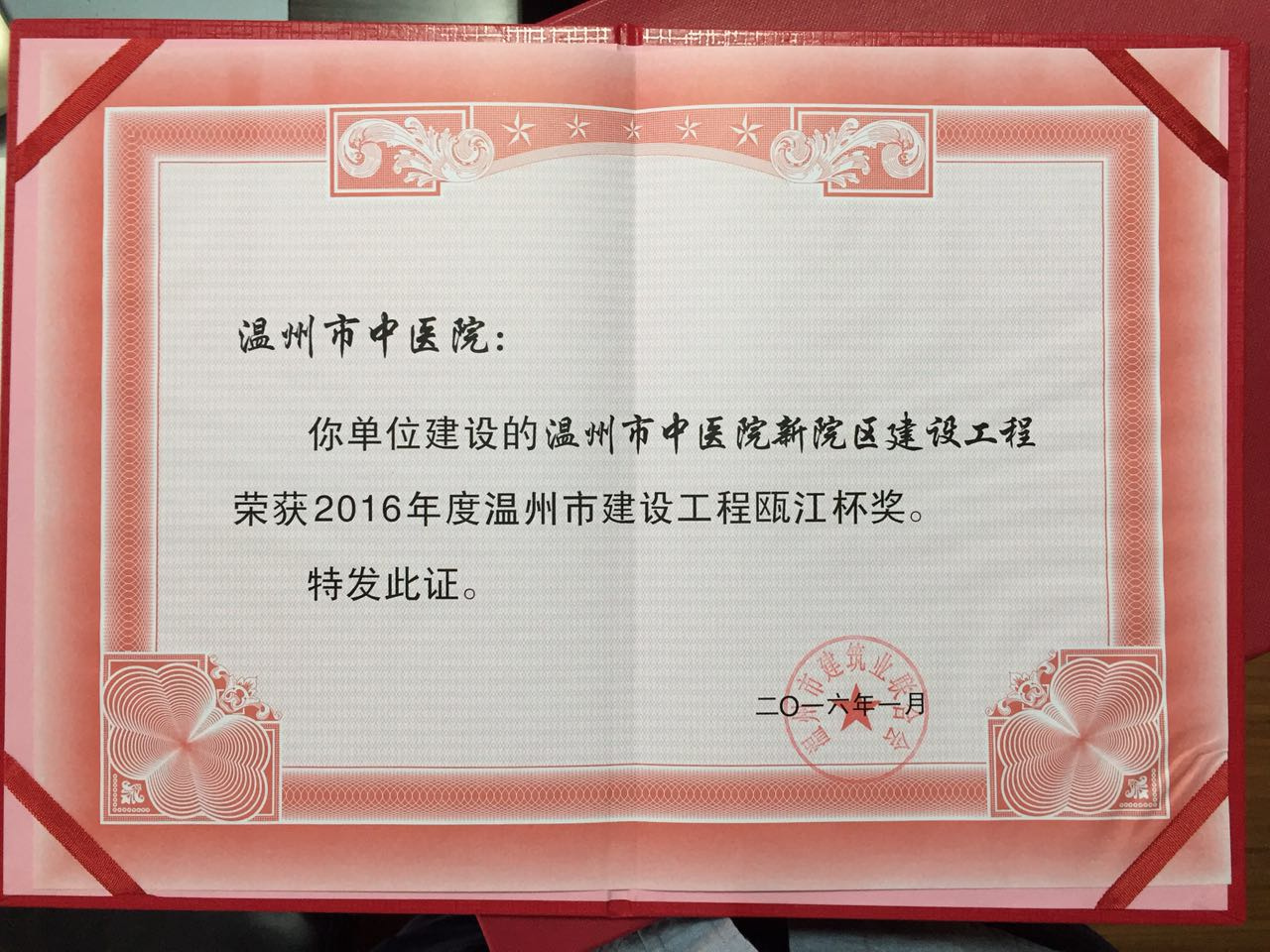在2016年7月26日举行的温州市建筑业联合会五届三次常务理事暨理事会议上,麻瑞龙副院长代表我院领取了荣誉证书及奖杯。