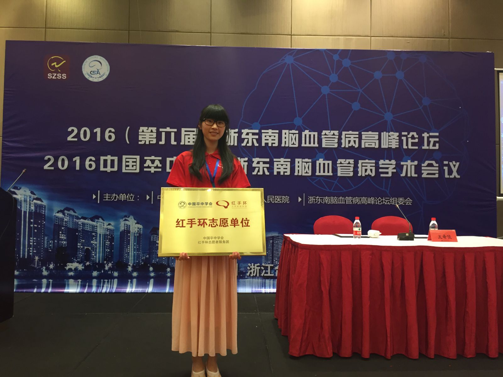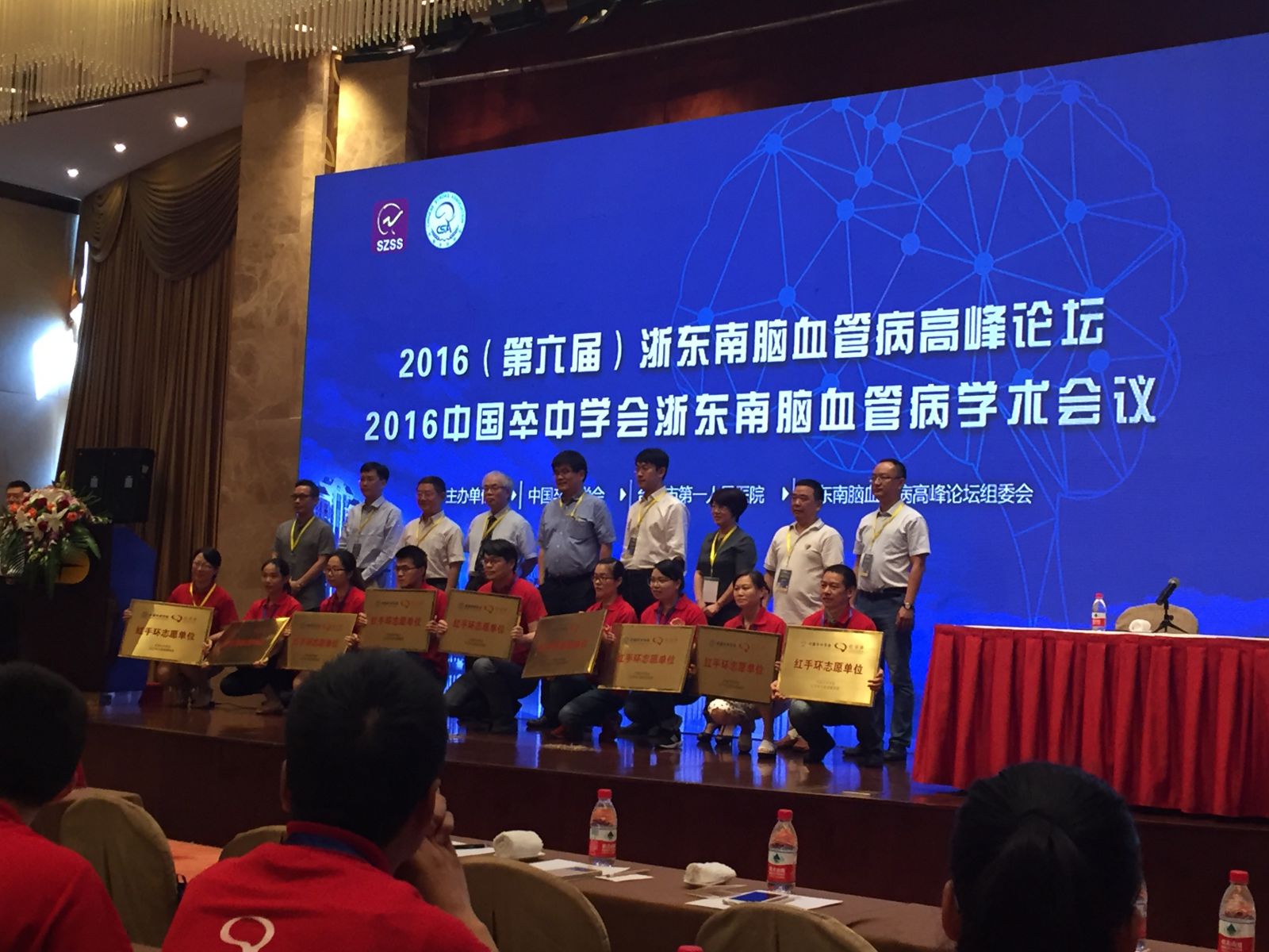 2016年9月3日,在台州召开的浙东南脑血管病学术会议上,中国卒中学会红手环志愿者服务团授牌仪式隆重举行。