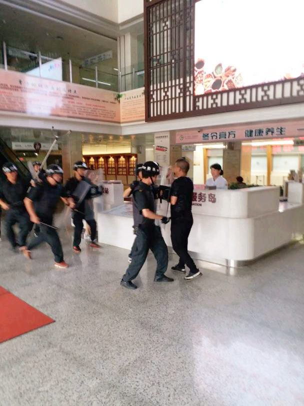 为提高我院保卫人员对反恐防暴事件的反应速度和应急处置能力,更好地维护医院正常的医疗秩序和保护医务人员的人身安全。2017年6月24日下午,在医院保卫科长的组织下,保卫人员在六虹桥院区门诊一楼大厅开展了一次逼真的反暴恐演练。