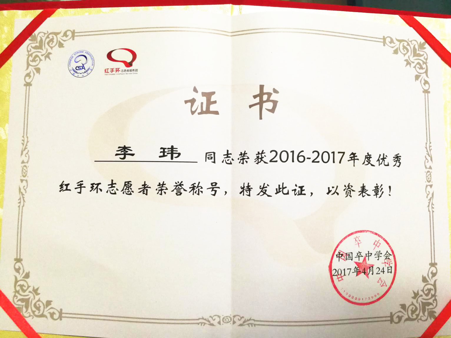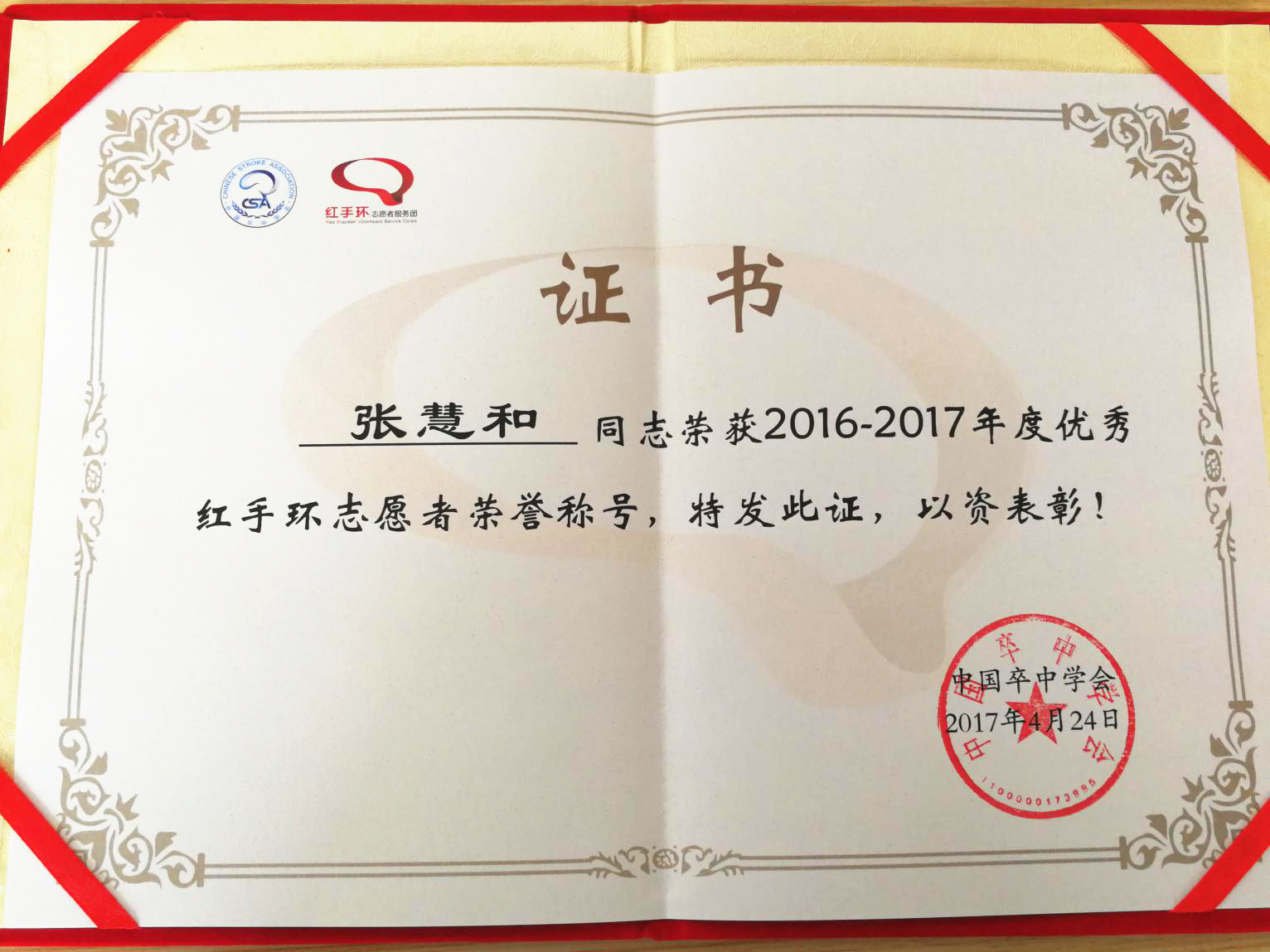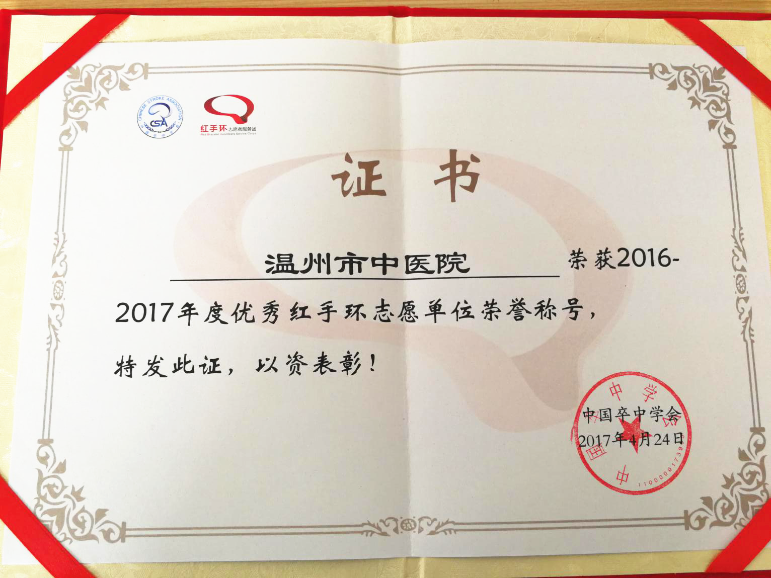 红手环志愿服务队,荣获2016-2017年度“优秀红手环志愿单位”称号;我院神经内科张慧和、李玮医师荣获“优秀红手环志愿者” 称号。目前,全国共有中国卒中中心联盟(CSCA)单位1894余家,红手环志愿服务团850家,志愿者人数超过25000余人,温州地区仅香蕉视频