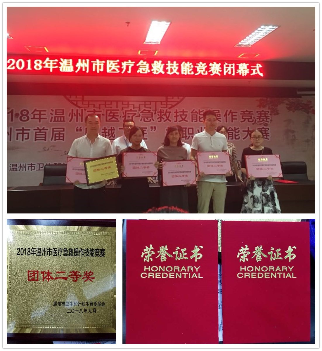 本次比赛注重急救操作技能,每一位选手都需要经过5个项目的考核,互相比拼综合实践操作能力。经过近10个小时紧张激烈的比赛,我院代表队荣获团体二等奖,我院急诊科潘一鹏、徐卡分获单项二等奖和三等奖。