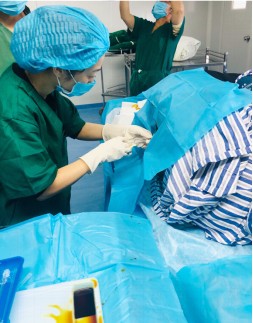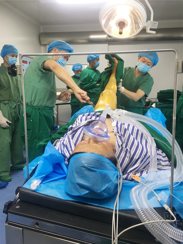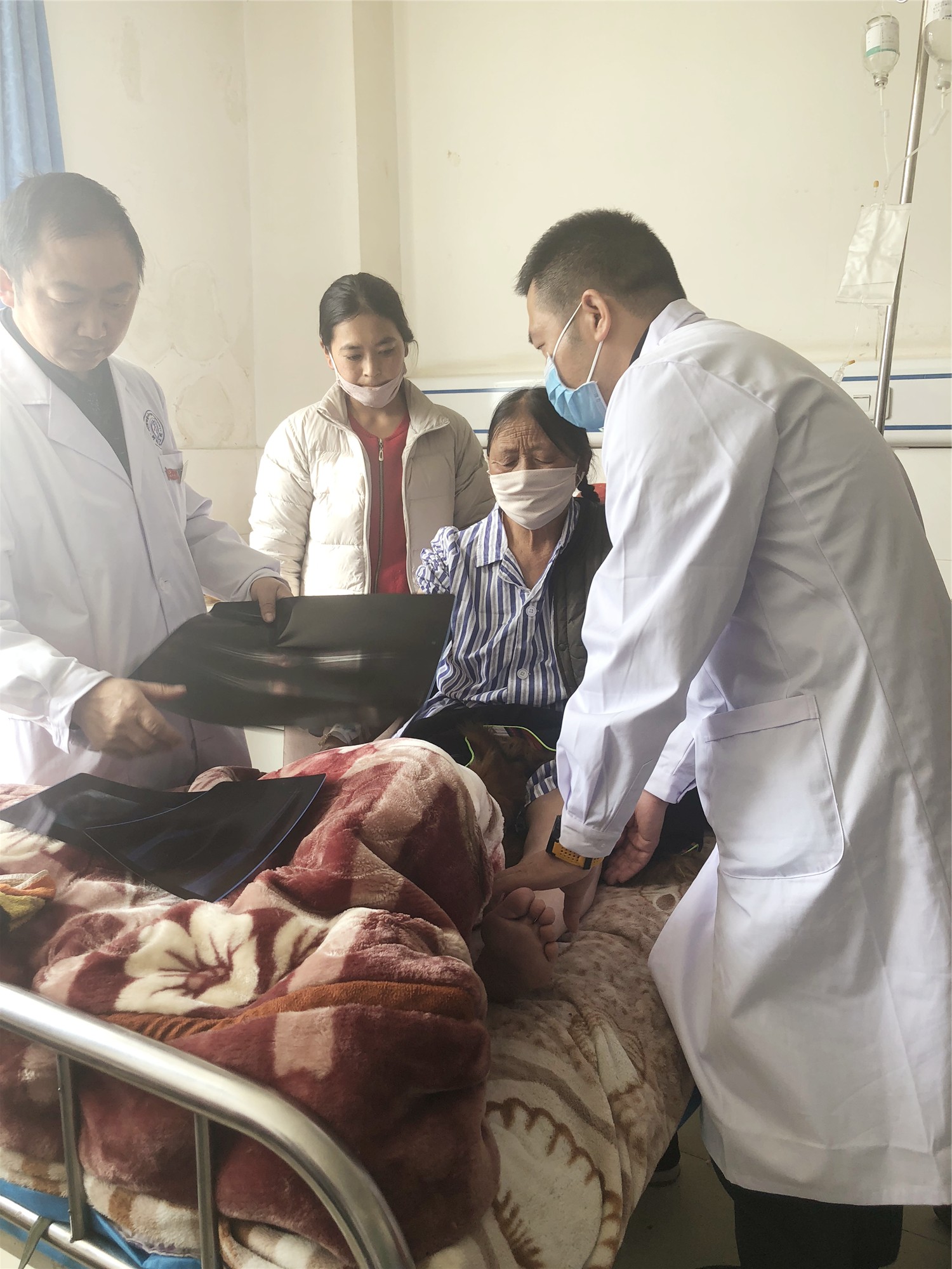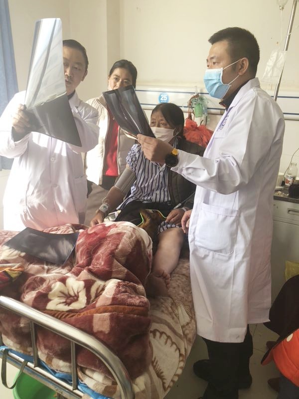李主任从定位、消毒、铺巾到手术关键操作,完全亲力亲为,认真做了示范和指导。在高原手术不比平原,尤其对于初来乍到的医疗队来说,对体能的消耗更大。术中,李主任都需要间断地吸氧维持自身氧合以确保自己对待病人对待手术能够保持最佳的状态。凭借他们一丝不苟的工作态度与丰富的临床经验,手术过程非常顺利,病人术毕安返病房,且术后康复地非常理想。在初次满意合作之后,他们在接下来的两天内又顺利地完成了四台全膝关节置换手术,每台手术都完成得超出预期,令县医院的医师及患者家属相当满意。