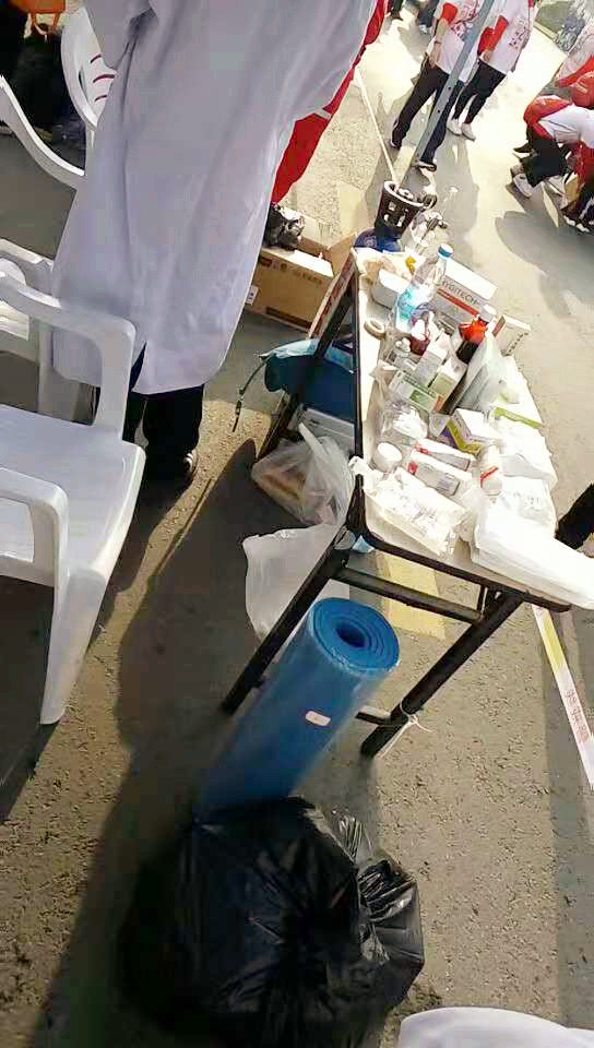 为让选手享受更好的温马,我院医疗队的小伙伴们早上6点就在比赛现场准备工作,医护人员分布在3个固定医疗点和4个流动点。