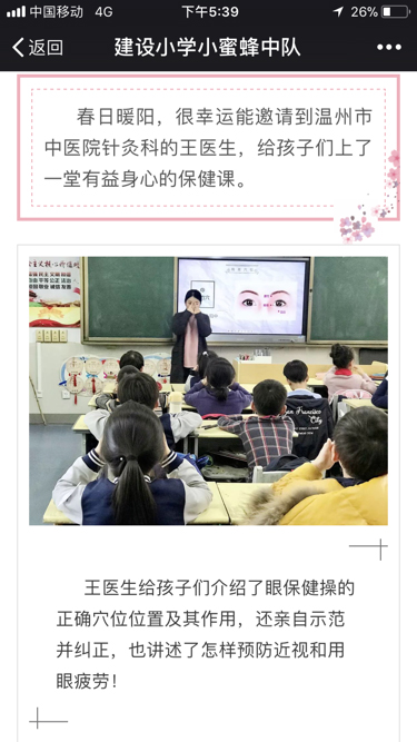 2018 年年3月22日,我院大士门党支部组织的《小穴位大保健》进校园系列活动走进了温州市建设小学(大南校区)。