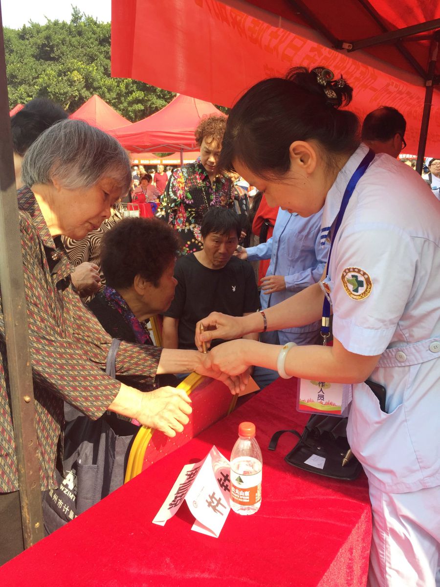 5月12日上午,义诊人员准时来到位于风景优美的九山湖畔的松台广场,当大家将中医操作的工具摆上台面时,立刻涌上了许多的群众。