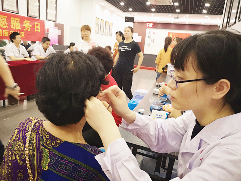 本次义诊活动筹备有序,现场分为问诊咨询,测量血压、血糖和耳穴埋豆等几个小组。其中问诊咨询组邀请了我院心血管内科潘兴丰副主任医师,针推科方君辉主治医师、神经内科黎斌医师、李玮医师,骨科张奎贤医师等前来坐诊。他们通过耐心的询问、认真的倾听和基本的检查,给予患者治疗、用药、心理疏导等方面的建议和意见;王洁护士长给现场有需要的居民进行了耳穴埋豆治疗。