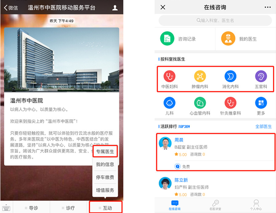 点击【互动】——【专属医生】,进入在线咨询,找到想要咨询的医生