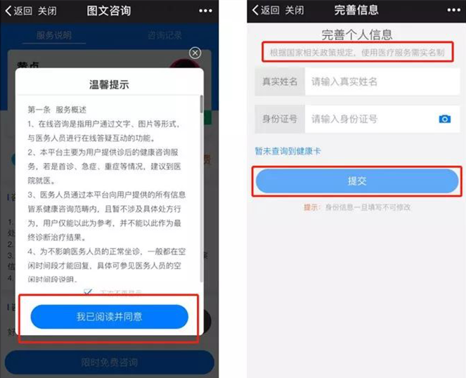 按提示绑定手机与实名身份证信息,这样院内报告也能发给医生了,线上咨询更方便