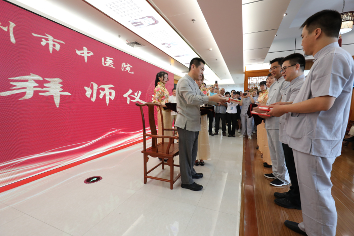 此次合作基于我院与上海曙光医院开展的一系列合作项目,上海曙光医院选派专家团队,对我院医疗、教学、科研、管理等方面进行指导,进一步提升我院的医疗技术实力和影响力。我院将以此次合作为契机,依托上海曙光医院骨伤科的资源优势,通过专家坐诊、查房、带教等形式,学习先进的临床技术、科研方法、人才培养措施等,进一步提升本院乃至本地区骨伤学科的技术水平,同时也让温州地区老百姓有机会享受到国内知名专家的优质服务。签约,授牌仪式之后,我院王庆来院长等3位学生通过行中国传统拜师礼仪,拜詹红生教授为师。学生们向詹红生老师敬茶,递上拜师贴和鲜花,詹红生老师收过拜师贴,饮过学生的敬茶后,向学生们递还回徒贴,并将一幅他亲手所著,写有“学而时习之”5个大字的书法作品赠与学生,代表着他对学生勤于学习、善于学习、温故知新、不断进步的期望和要求。