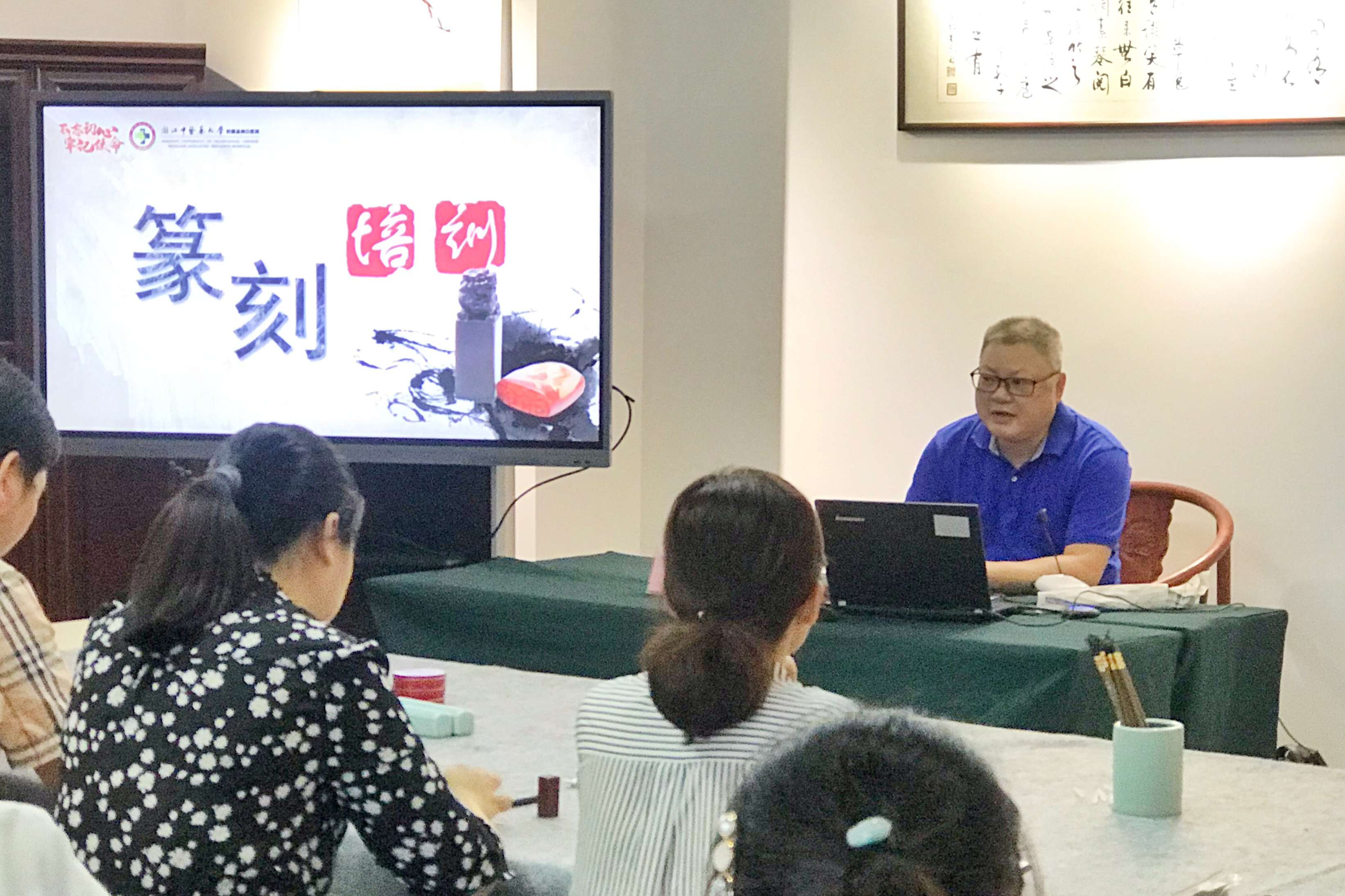 培训班特邀请到温州市书法家协会理事、篆刻创作委员会副主任张紫梁老师对职工进行授课。张老师从古代印章的产生、古代印章的用途、印章的各种名称及区别等内容开讲,带领大家“走近”篆刻,也介绍了篆刻的工具、印材、刀法等等,生动有趣、内容丰富的授课让大家对篆刻知识有了最全面的了解。