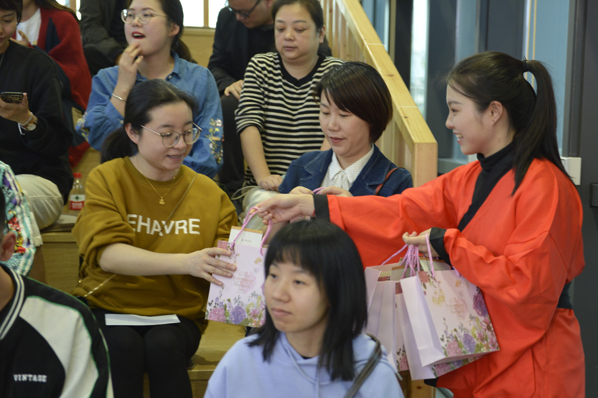 在最后的送吉祥环节,四名穿着国服的实习治疗师向每一位与会人员送上了特别的吉祥物——由香蕉视频 特制的香囊、花茶以及药膳。