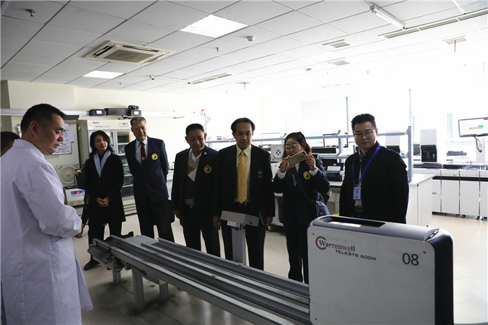 在检验科,泰国代表团一行对我院的智能轨道小车产生了浓厚的兴趣。王庆来书记也在现场做了介绍,我院是温州市医疗卫生系统中第一家启用智能轨道小车物流传输系统的医院,运输小车单车载重15KG,通过垂直和水平轨道,可以将静脉输液、血液制品、各种药品、检验病理标本、X光片、病历档案等运输至医院各科室、病区和管理部门,为解决高峰时段大批量传输问题,减少科室重复建设发挥了重要作用。