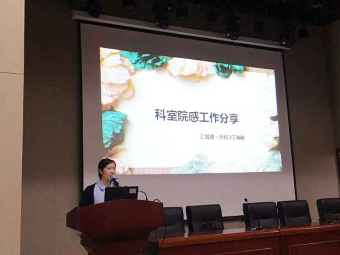 为提高交流,本次会议特安排优秀监控员代表分享经验。外科3汪海敏护士长从医护配合有效沟通、配合院感科工作、科室平时院感管理、院感记录本书写四个方面交流,内容实用;综合内科1的黄志有医师分享了自己感控知识来源渠道和导管血流感染的防控知识,他积极的学习态度和严谨的工作态度赢得了大家的掌声。