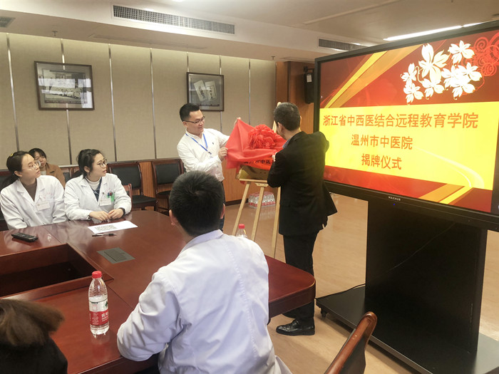 仪式前,医务科科长陈念昭介绍了浙江省中西医结合远程教育学院作用与功能,指出浙江省中西医结合远程教育学院网络平台的应用优势:通过平台暂停或重复播放功能,能实时有效学习教学视频,清楚演示出医学操作,通过录播功能节省教学成本,且网络不受时空限制,方便学习,帮助医师拓宽知识面,积累临床操作经验,实现各医院之间优质医学教学资源共享。