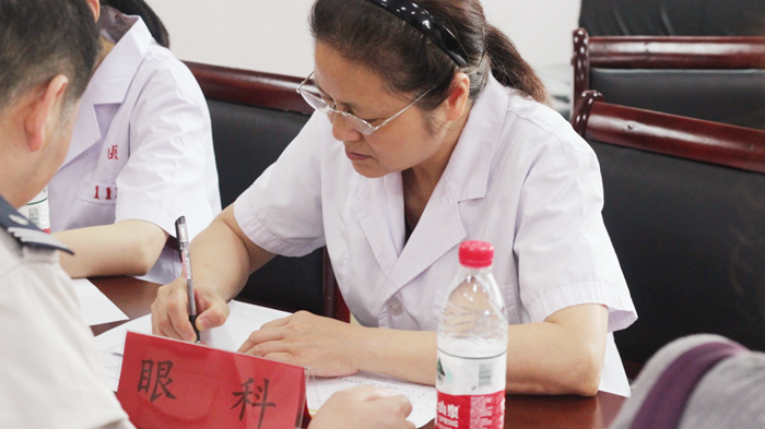 眼科医生潘小云主任医师为公交集团成员进行眼部检查及平时护眼科普宣传。