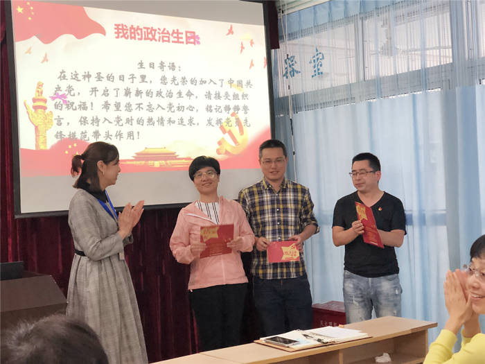 陈丽娜书记给他们递上生日贺卡并送了生日寄语:在这神圣的日子里,您光荣的加入了中国共产党,在开启了崭新的政治生命,请接受组织的祝福!希望您不忘入党初心,铭记铮铮誓言,保持入党时的热情和追求,发挥党员先锋模范带头作用!