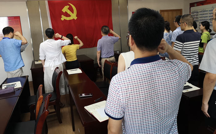 首先,支部书记夏平易携全体党员面向党旗,庄严宣誓,“我志愿加入中国共产党,……永不叛党”,重温入党誓词,时刻提醒我们党员应该不忘初心,发挥一名党员医务工作者的先锋模范作用,全心全意为人民的健康事业服务,为我们医院发展努力奋斗。