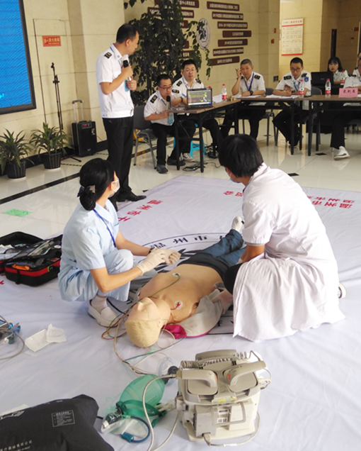 竞赛分为理论知识和操作技能两部分内容,理论知识部分采取笔试形式,操作技能部分采取现场模拟操作形式。操作技能部分需要医护及时准确判断保健对象病情,现场做出心电监护诊断,建立静脉通路合理使用急救药物,进行电除颤和心肺复苏等急救操作,对保健对象进行院前转运。领队员需要在现场与接诊医院进行电话沟通,报告现场救治情况,下达救治任务,向带队领导报告现场救治等情况。带队领导需要对急救做好统筹安排。