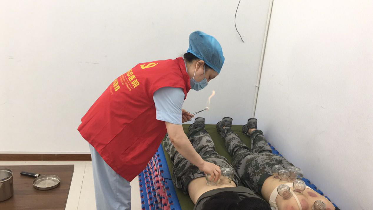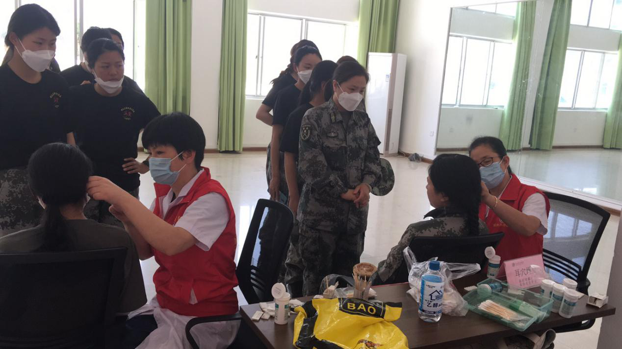 (门诊党支部书记戴清辉、保健科科长邹碧泉、质管科黄香妹科长和针推理疗科主管护师汤茹平为女民兵提供耳穴治疗、拔罐等中医特色治疗。)