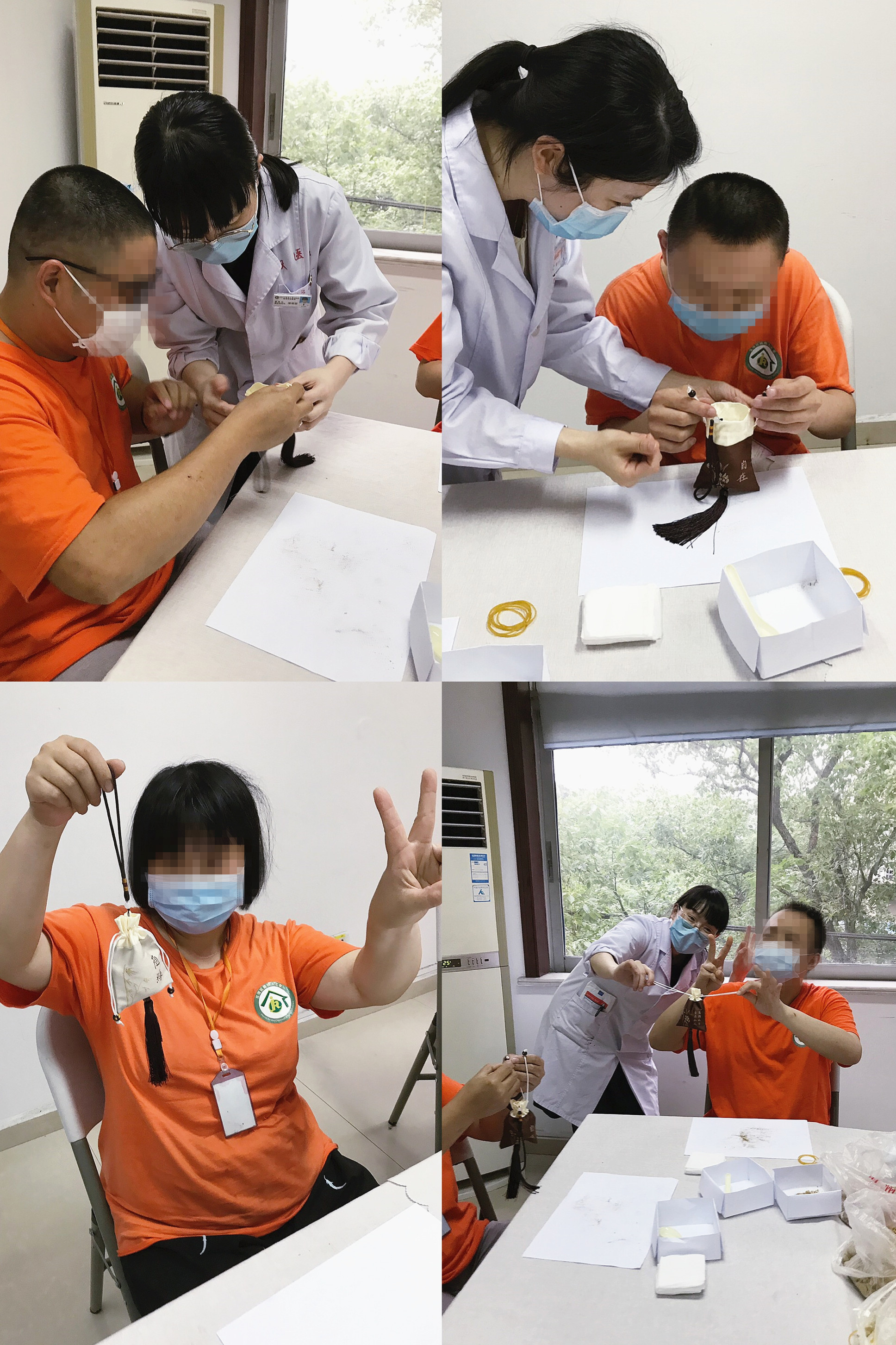 6月19日下午,香蕉视频 水心景山党支部的党员们来到龙湾区青苗残疾人之家,跟这里的学员们共同开展了传承中医文化,制作香囊活动。