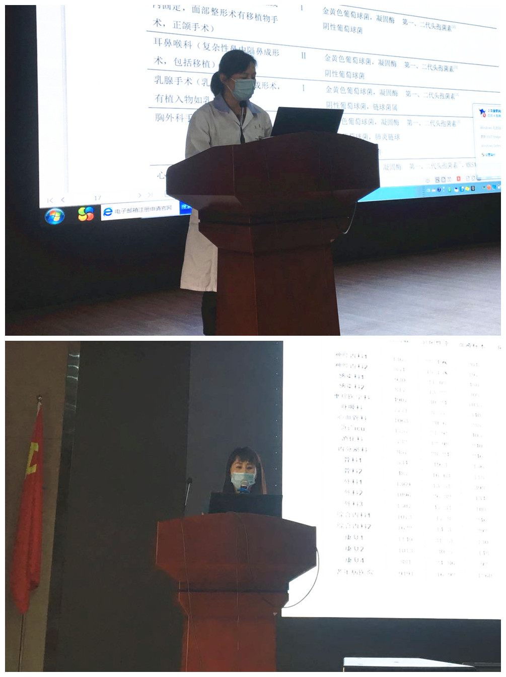 培训会还安排药剂科的郑宇红临床药师主讲了《II类切口围手术期抗菌药物合理使用》,检验科微生物室金晓立汇报《2019年医院细菌耐药监测统计汇总报告》。