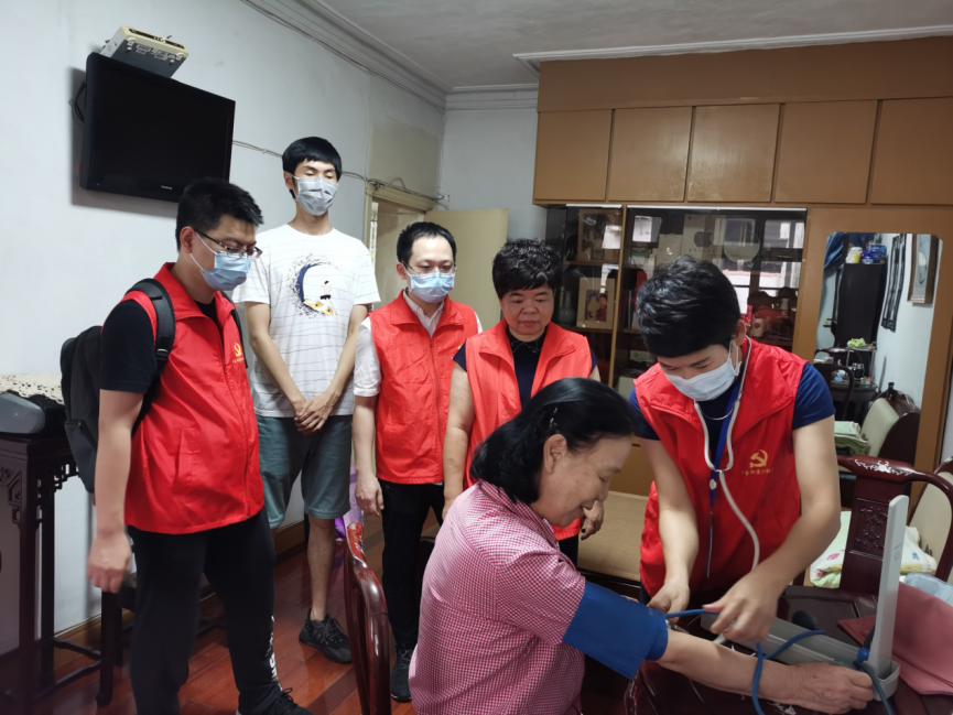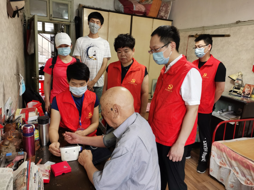 门诊党支部志愿者们对劳模老党员虞宝森、邱芬芬等同志进行上门走访慰问。首先来到了95岁高龄老党员虞宝森家中,刘三海医生详细询问他目前身体状况,为其测血压、听诊和检查身体的各项体征。