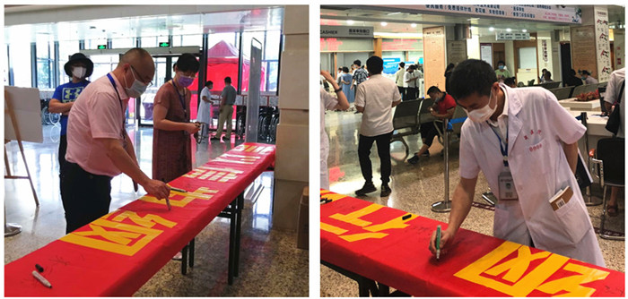 在现场,医护人员背诵《医疗卫生行风建设“九不准”》。医院党委书记王庆来,院长朱文宗,副院长麻瑞龙、缪心军等院领导以及各临床科室负责人以身作则在诚信医疗横幅上郑重地签下自己姓名。现场的医护人员也积极响应并签名,坚决执行诚信行医和患者至上的医疗服务,誓将诚信医疗深入到每一个医疗环节。